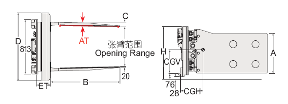 Capacity 承載能力(kg)Catalog Order NO 型號Mounting Class 安裝等級 Opening Range張臂范圍(mm)Arm Height臂高A(mm)Arm Length臂長B(mm)Arm Thickness臂厚C(mm)Overall Height總高H(mm)Frame Width 框架寬度D(mm)Arm Toe in內(nèi)扣量AT(見注5)(mm)Weight 自重(kg)Effective 失載距ET(mm)Horizontal Center of Gravity 水平重心CGH(mm)